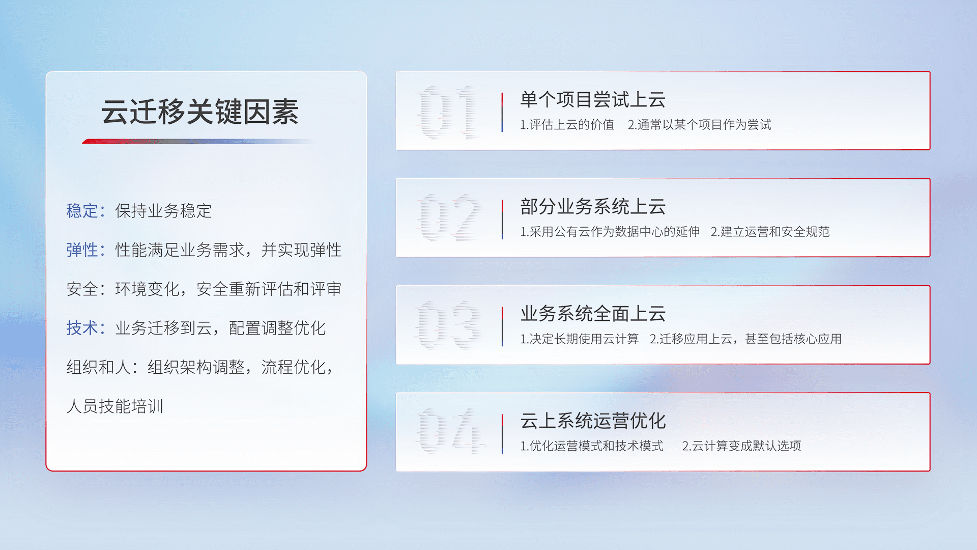 结合实际业务,,从规划设计、、云平台选型、、云原生改造、、、、数据迁移、、集成交付,,,,迁移全过程为客户识别最佳上云路径,,,,做好风险识别管理,,,设计网络架构、、、、身份权限、、、安全审计合规、、操作审计、、、、日志审计、、、监控告警策略、、、、多站点容灾设计等,,,,对云上基础设施进行整体规划,,,提升IT治理水平,,,,以满足弹性、、、高可用、、、、高性能的需求。。