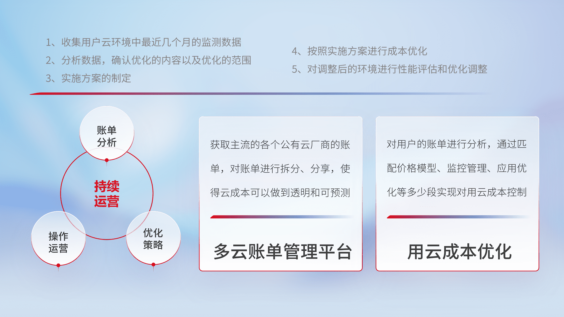 通过多云纳管,,以统一的资源数据模型把客户的云资源进行抽象和封装,,,,进而实现对多云资源的统一操作,,保障云资源管理的可靠性、、、稳定性与可用性。。量身定制化运维内容,,,,配置、、、开发运维、、补丁管理、、备份、、监控、、认证和访问管理、、、审计和日常巡检等,,,,保障在用云过程中的可靠度,,,稳定度以及高可用率。。。